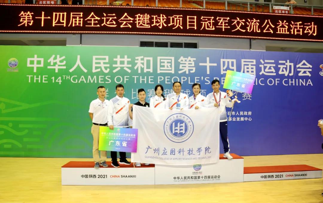 ▲ 我校体育科技学院院长张军教授担任领队、高浩光老师入选为运动员的广东毽球队,在第14届全运会为广东省夺得一枚金牌。