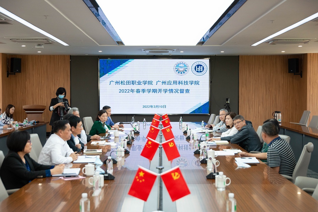3月10日下午,广东省教育厅政策法规处一级调研员袁俊率领省教育厅开学工作专项督导组一行,莅临我校开展2022年春季学期开学学校疫情防控和安全工作督导检查。省教育厅政策法规处干部梁嘉仪参加检查,广州应用科技学院、广州松田职业学院董事长刘剑锋,我校执行校长庞永师、党委书记王永云等党政领导,以及广州松田职业学院有关校领导接待了督导组一行。
