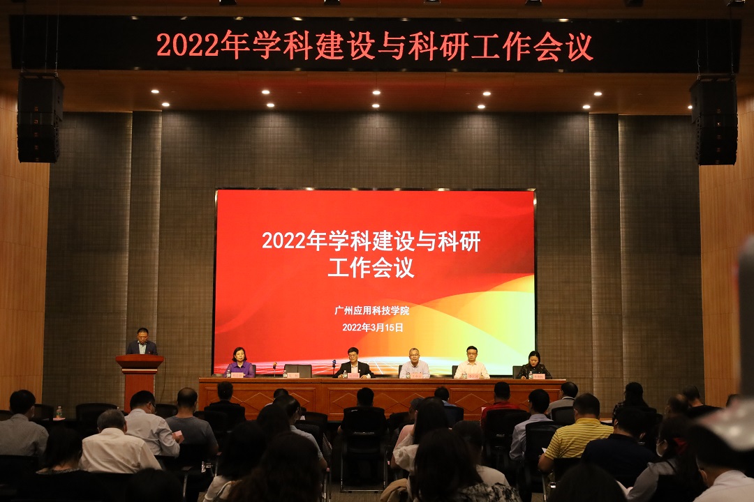 副校长李江凌作《改革奋进、谋实破局,开创学科建设科研工作新局面》的报告,对2021年学校学科建设与科研工作进行总结回顾,对2022年工作进行部署。在学校董事会、校党委、校行政正确领导、支持和带领下,在全校教职工密切配合和共同努力下,2021年度我校学科建设和科研工作有所推进,取得了一定成绩。2022年,我校将以习近平新时代中国特色社会主义思想为指导,依据《广州应用科技学院“十四五”教育事业发展规划纲要》《广州应用科技学院学科专业“十四五”建设规划》《广州应用科技学院科学研究与社会服务“十四五”发展规划》,通过加强学科建设,为专业建设奠定坚实基础;加强科研工作管理,促进科研明显进步;注重内涵发展,增强服务社会能力;加强“基地”建设,提高决策咨询水平等四项主要任务,对接区域经济社会需求、加强顶层设计、整合学科资源、创新管理机制、加强传统优势学科、培育应用特色学科,构建与粤港澳大湾区、广州和肇庆地区经济文化、主导产业密切相关的多学科协调发展的学科体系,全面提高学校的学科建设水平和科学研究水平,提升服务地方社会发展、文化传承和产业转型升级的能力,为把我校建设建设成为一流应用型大学提供学科、科研支撑。